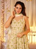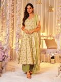 Exude major dreamy vibes with this cream color readymade anarkali style kameez in muslin. Crafted using digital printed all over. Teamed with a cream color dupatta in muslin and a green color palazzo style bottom made in muslin. Note: Accessories shown are for styling purpose only. Slight color variation may occur due to photographic reasons.