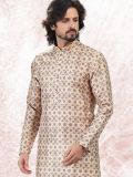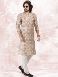 Get your hands on this soft cream color kurta made in banarasi silk. Augmented with a printed details all over, with potli buttons along the placket. Comes with a white color churidar pants in art silk. Note: Some color variations may occur owing to photography causes. Up to 1 inch of measurement fluctuation is possible.