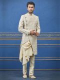Magnificent Look Cream Colour Silk Fabric Men's Indowestern With Matching Pyjama and Thread Work.