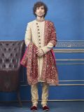 Genuine Attractiveness Will Come Out As A Results Of The Dressing Trend With This Cream Colour Jamawar Fabric Men`S Sherwani With Thread,Zari,Zardozi Work.