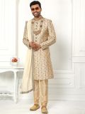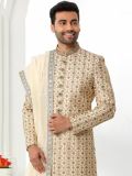 Presenting this cream color sherwani made in art silk. Decorated using zari, sequins embroidery with stones embellishment work. Teamed with cream color churidaar in dupion silk and a matching embroidered stole. Note: Some color variations may occur owing to photography causes. Up to 1 inch of measurement fluctuation is possible.