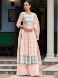 Steal the limelight sporting this cream color gathered kameez in georgette. Enriched using sequins and thread embroidery all over. Comes with matching cream net dupatta and a matching palazzo in georgette. Note: Accessories shown are for styling purpose only. Slight color variation may occur due to photographic reasons. The semi-stitched kameez can be customised upto 42 inches.