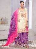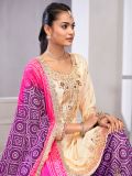 Glam up with grace with this cream color straight cut kameez made in chinon silk. Crafted using sequins, stone and mirror work embellishment or heavy zari embroidered work with bandhej printed pattern all over. Available with a magenta color printed palazzo style bottom and a magenta and pink color bandhani printed dupatta, both made in chinon silk. Note: Accessories shown are for styling purpose only. Slight color variation may occur due to photographic reasons. The semi-stitched kameez can be customised upto 42 inches.
