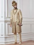 Make a fashion statement dressed in this fabulous Cream,Golden Color Silk Sherwani With Matching Churidar Pyjama Zari,Zardozi,Embroidery Work.