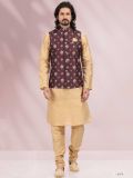 Get your hands on this cream color kurta made in art silk. Enhanced with a maroon color printed nehru jacket made in banarasi silk. Teamed with cream color churidaar in art silk. Note: Some color variations may occur owing to photography causes. Up to 1 inch of measurement fluctuation is possible.