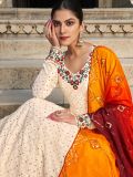 Look no less than a dream wearing this cream color anarkali kameez in georgette. Augmented using sequins and thread work embroidery all over. Assembled with a multicolor chiffon dupatta and a matching bottom in crepe. Note: Accessories shown are for styling purpose only. Slight color variation may occur due to photographic reasons. The semi-stitched kameez can be customised upto 42 inches.