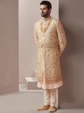 Exude mesmersing sights adorning this cream color sherwani made in silk. Decorated using thread work, hand work embroidery and zardozi embellishment work. Teamed with cream color churidaar in silk and a matching kurta underneath. Note: Some color variations may occur owing to photography causes. Up to 1 inch of measurement fluctuation is possible.