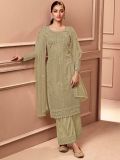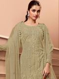 Steal the spotlight adorning this fossil cream color staright cut kameez in net. Furnished with stones and thread embroidery all over. Comes with a matching net dupatta and pants in satin. Note: Accessories shown are for styling purpose only. Slight color variation may occur due to photographic reasons. The semi-stitched kameez can be customised upto 42 inches.