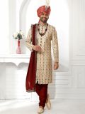 Grab all the compliments wearing this cream color sherwani made in art silk. Elevated using zari, sequins embroidery with stones embellishment work. Assembled with maroon color churidaar in dupion silk and a matching maroon embroidered stole. Note: Some color variations may occur owing to photography causes. Up to 1 inch of measurement fluctuation is possible.