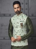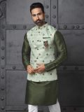 Grace the occasion with your presence wearing this in this green color kurta set designed in jacquard silk. Augmented with weaving. Comes with a white color pant in art silk and a pista green color upper jacket with cut sleeeves made in jacquard. Note: Some color variations may occur owing to photography causes. Up to 1 inch of measurement fluctuation is possible.