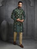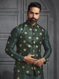 Embrace your ethnic self as you adorning this green color kurta set designed in jacquard silk. Augmented with weaving. Comes with a cream color pant in art silk and a green color upper jacket with cut sleeeves made in jacquard. Note: Some color variations may occur owing to photography causes. Up to 1 inch of measurement fluctuation is possible.