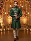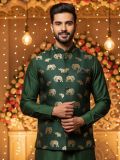 Show your feminine side to the world wearing this dark green color kurta designed in art silk. Augmented with weaving pattern all over. Comes with a matching green color nehru jacket and a cream color pyjama both, made in art silk. Note: Some color variations may occur owing to photography causes. Up to 1 inch of measurement fluctuation is possible.