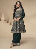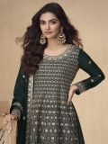 Shine brighter wearing this dark green color flare style kameez in chinon silk. Decorated using sequins and zari work embroidery all over. Paired with a green color dupatta and a palazzo style bottom, both made in chinon silk. Note: Accessories shown are for styling purpose only. Slight color variation may occur due to photographic reasons. The semi-stitched kameez can be customised upto 42 inches.