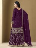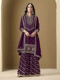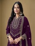 Give a glamorous glance wearing this deep purple color straight cut kameez in art silk. Augmented using sequins and zari work embroidery all over. Comes with a art silk dupatta and a sharara style bottom in dolla silk, both made in purple color. Note: Accessories shown are for styling purpose only. Slight color variation may occur due to photographic reasons. The semi-stitched kameez can be customised upto 42 inches.