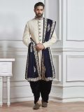 Add subtle glamour to the robust personality in this White Color Self Sherwani With Matching Patiala And Zardozi Work.