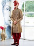 Add subtle glamour to the robust personality in this Golden Colour Brocade Fabric Men's Sherwani With Matching Patiala And Embroidery,Zardozi,Zari Work.