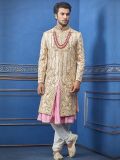 Add A Adolescent Burst Of Colour For Your Wardrobe With This Golden Colour Silk Fabric Men's Sherwani With Thread,Zari,Zardozi Work