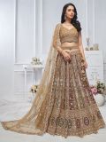 Dazzle the audience as you wear this golden color bridesmaid lehenga in soft net. Elevated with sequins, stone and floral thread embellished with heavy zari embroidery all over. Paired with a matching golden color embroidered choli and a golden color dupatta, both made in soft net. Note: The accessories featured are purely for fashion purposes. Due to photography reasons, some color variations may occur. The semi-stitched choli and lehenga waist may be customized up to 42 inches.