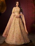 Look no less than a dream wearing this golden color bridesmaid lehenga in net. Elevated with sequin and heavy floral thread embroidery all over. Paired with a matching golden color embroidered choli in net and golden color dupatta, made in net. Note: The accessories featured are purely for fashion purposes. Due to photography reasons, some color variations may occur. The semi-stitched choli and lehenga waist may be customized up to 42 inches.