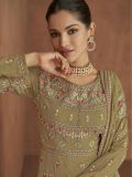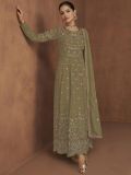 Make a statement wearing this moss green color anarkali kameez in georgette. Enhanced using thread and zari work embroidery with stones all over. Assembled with a matching georgette dupatta and a matching palazzo in shantoon. Note: Accessories shown are for styling purpose only. Slight color variation may occur due to photographic reasons. The semi-stitched kameez can be customised upto 42 inches.
