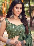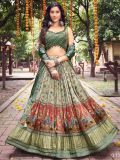 Evoke the diva in you with this dusty green color floral printed lehenga in art silk. Comes with a green art silk choli designed with mirror work and thread embroidery and an art silk dupatta in green. Note: The accessories featured are purely for fashion purposes. Due to photography reasons, some color variations may occur. The semi-stitched choli and lehenga waist may be customized up to 42 inches.