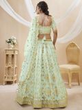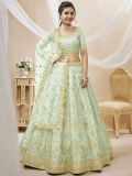 Turn some heads wearing this mint green color lehenga in art silk. Furnished with gota patti, zari embroidered work. Teamed with a matching green color embroidered art silk choli and a green net dupatta with scalloped borders. Note: The accessories featured are purely for fashion purposes. Due to photography reasons, some color variations may occur. The semi-stitched choli and lehenga waist may be customized up to 42 inches.