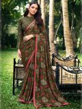 Up your casual styling game adorning this army green color saree crafted in chiffon. Designed using digital floral patterns and foil printed patterns, showcasing distinstive borders. Available with a matching green color printed blouse in chiffon. Note: The accessories featured are purely for fashion purposes. Due to photography reasons, some color variations may occur. The un-stitched blouse may be customized up to 42 inches.