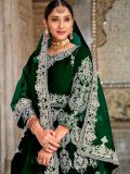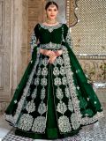 Exude a glamorous sight with this green color anarkali kameez in velvet. Curated using zari and thread work embroidery with stones all over. Paired with a matching net dupatta and a matching bottom in net. Note: Accessories shown are for styling purpose only. Slight color variation may occur due to photographic reasons. The semi-stitched kameez can be customised upto 42 inches.