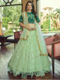 Brighten up your surroundings wearing this light green color designer lehenga in net. Augmented with sequins and thread embroidered work. Teamed with a matching green color embroidered choli in art silk and green net dupatta. Note: The accessories featured are purely for fashion purposes. Due to photography reasons, some color variations may occur. The semi-stitched choli and lehenga waist may be customized up to 42 inches.