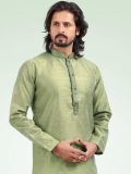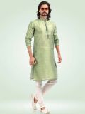 Enhance your festive look adorning this metallic green color men's kurta made in banarasi silk. Elevated using sequins and thread embroidery details all over. Teamed with matching white color churidar pants in art silk. Note: Some color variations may occur owing to photography causes. Up to 1 inch of measurement fluctuation is possible.