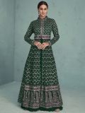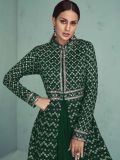 Elevate your festive wardrobe adorning this green color jacketed kameez in georgette. Furnished using zari and thread work embroidery with stones all over. Assembled with a matching chiffon dupatta and a matching bottom in shantoon. Note: Accessories shown are for styling purpose only. Slight color variation may occur due to photographic reasons. The semi-stitched kameez can be customised upto 42 inches.