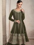 Walk with grace adorning this olive green color flared kameez in georgette. Furnished using thread, zari and sequins embroidery all over. Available with a matching georgette dupatta and a matching sharara in georgette. Note: Accessories shown are for styling purpose only. Slight color variation may occur due to photographic reasons. The semi-stitched kameez can be customised upto 42 inches.