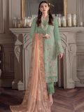 Get all dolled up adorning this sea green color straight cut pakistani style kameez in georgette. Enhanced using thread embroidery all over. Comes with matching shantoon pants and a peach dupatta in chiffon. Note: Accessories shown are for styling purpose only. Slight color variation may occur due to photographic reasons. The semi-stitched kameez can be customised upto 42 inches.