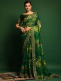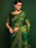 Allure the crowd adorning this green color saree crafted in georgette. Furnished using floral printed patterns, showcasing distinstive borders enhanced with zari and sequins embroidery. Comes with an embroidered green color blouse in georgette. Note: The accessories featured are purely for fashion purposes. Due to photography reasons, some color variations may occur. The un-stitched blouse may be customized up to 42 inches.