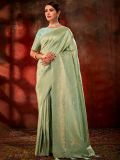 Make a statement adorning this lush green color saree crafted in art silk. Elevated using zari woven patterns all over with threaded tassels along the pallu. Teamed with a matching green color blouse in art silk. Note: The accessories featured are purely for fashion purposes. Due to photography reasons, some color variations may occur. The un-stitched blouse may be customized up to 42 inches.