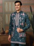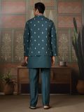 Channel effortless glam as you wear this peacock green color readymade kurta designed in viscose silk. Furnished with sequins with floral thread embellishment work all over. Comes with a mathching green color pyjama and a green color front open embroidered jacket, both made in viscose silk. Note: Some color variations may occur owing to photography causes. Up to 1 inch of measurement fluctuation is possible.
