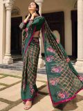 Wrap yourself in style with this deep green color saree crafted in georgette. Enhanced using digitally printed geometric patterns with distinstive borders enhanced with satin lace. Assembled with a matching green color blouse in georgette. Note: The accessories featured are purely for fashion purposes. Due to photography reasons, some color variations may occur. The un-stitched blouse may be customized up to 42 inches.
