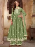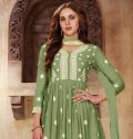 Look elegant as you wear this green color anarkali style kameez in georgette. Furnished using thread embroidery all over. Elevated with a matching chiffon dupatta and a palazzo in georgette. Note: Accessories shown are for styling purpose only. Slight color variation may occur due to photographic reasons. The semi-stitched kameez can be customised upto 42 inches.