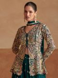 Adorning yourself in the poetry wearing this dark teal green color full sleeved front slit cut flare style short kameez designed in chinon silk. Furnished using sequins, hand work embellishment and floral thread work with heavy zari embroidery all over. Comes with a matching green color palazzo style bottom and a green color dupatta, both made in chinon silk. Note: Accessories shown are for styling purpose only. Slight color variation may occur due to photographic reasons. The semi-stitched kameez can be customised upto 42 inches.