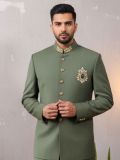 Generate a classic choice of trends wearing this olive green color layered style indowestern designed in italian fabric. Designed using hand work embellishment. Paired with a matching green color pant made in Italian fabric. Note: Some color variations may occur owing to photography causes. Up to 1 inch of measurement fluctuation is possible.