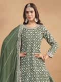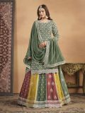 Be the epitome of grace wearing this sage green color designer lehenga in chinon silk. Elevated with sequins and thread work embroidery all over. Comes with a embroidered lehenga style bottom and a matching sage green color dupatta in chinon silk. Note: The accessories featured are purely for fashion purposes. Due to photography reasons, some color variations may occur. The semi-stitched choli and lehenga waist may be customized up to 42 inches.