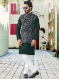 Keep shinning bright adorning this deep green color kurta made in jacquard. Topped with a green velvet nehru jacket enriched with thread embroidered details. Comes with a white color trouser pants in cotton. Note: Some color variations may occur owing to photography causes. Up to 1 inch of measurement fluctuation is possible.