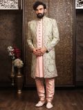 Stand out of the crowd adorning this green color indo western made in silk. Enhanced using thread embroidered details and stones. Paired with peach color pants and a liner in silk. Note: Some color variations may occur owing to photography causes. Up to 1 inch of measurement fluctuation is possible.