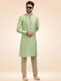 Exhibiting this light green color men's kurta made in banarasi silk. Augmented using thread embroidered details all over. Comes with matching cream color churidar pants in art silk. Note: Some color variations may occur owing to photography causes. Up to 1 inch of measurement fluctuation is possible.