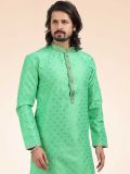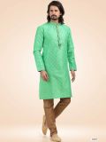 Elevate your ethnic look adorning this seafoam green color men's kurta made in banarasi silk. Decorated using jacquard weaving details all over. Available with matching brown color churidar pants in art silk. Note: Some color variations may occur owing to photography causes. Up to 1 inch of measurement fluctuation is possible.