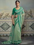 Get your hands on this light green color saree crafted in organza. Furnished using brasso patterns all over. Paired with an embroidered sea green color blouse in organza. Note: The accessories featured are purely for fashion purposes. Due to photography reasons, some color variations may occur. The un-stitched blouse may be customized up to 42 inches.