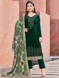 Walk with ease adorning this deep green color straight cut kameez in georgette. Furnished using stones work all over. Available with green georgette dupatta drenched in thread work and a matching pant in shantoon. Note: Accessories shown are for styling purpose only. Slight color variation may occur due to photographic reasons. The semi-stitched kameez can be customised upto 42 inches.