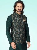 Elevate your festive closet with this green color kurta made in art silk. Enhanced using jacquard woven banarasi silk jacket in green shade. Assembled with matching green color churidaar in art silk. Note: Some color variations may occur owing to photography causes. Up to 1 inch of measurement fluctuation is possible.