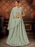 Slay with ethnic look as you wear this sage green color lehenga in net. Designed with resham embroidered work all over. Available with a matching green color embroidered choli and green dupatta, both made in net. Note: The accessories featured are purely for fashion purposes. Due to photography reasons, some color variations may occur. The semi-stitched choli and lehenga waist may be customized up to 42 inches.