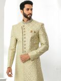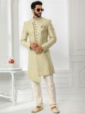 Walk with style wearing this metallic green color sherwani made in art silk. Designed using thread embroidery with sequins embellishment work. Comes with white color churidaar in dupion silk. Note: Some color variations may occur owing to photography causes. Up to 1 inch of measurement fluctuation is possible.